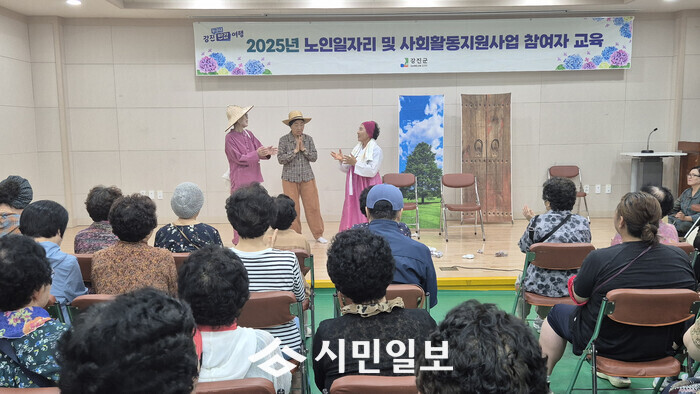 | ▲ 강진군이 실시하고 있는 2025년 노인일자리 및 활동지원사업 참여자 교육에 참여한 대상자들이 '사당나무 그늘아래' 공연을 관람하고 있다. / 강진군 제공 |
