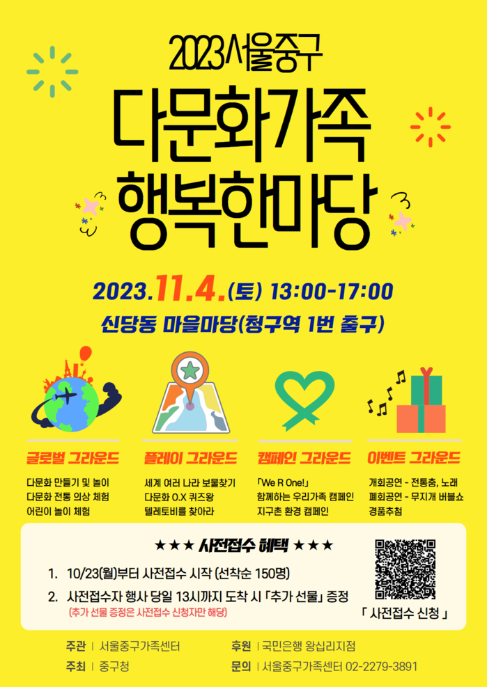 중구가족센터는 오는 11월4일 신당동 마을마당(청구역 1번 출구 앞)에서 오후 1~5시 다문화가족 300여명과 함께 ‘다문화가족 행복한마당(이하 다문화 한마당)’을 개최한다.