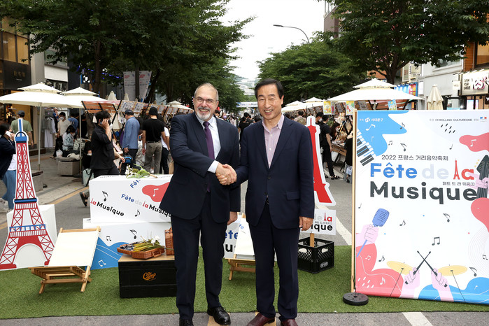 지난 18일 서대문구 신촌 연세로에서 열린 프랑스 거리음악축제에 참석한 문석진 구청장(오른쪽)과 필립 르포르 주한 프랑스 대사가 악수를 나누고 있다. 서대문구가 주최하고 주한프랑스대사관이 후원하는 이 행사는 3년 만에 재개됐으며 19일까지 열렸다. (사진제공=서대문구청)