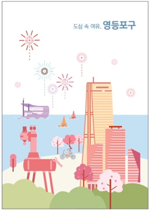 | ▲ 다국어 관광가이드북 앞표지 예시(안) (영등포구 대표 관광지인 63스퀘어, IFC몰, 여의도공원, 이랜드크루즈, 문래동 철공소를 이미지로 나타낸 표지로 새로운 구도와 색감으로 변형 예정) (사진=영등포구청 제공) |
