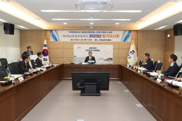 [해남=정찬남 기자] 재단법인 해남문화관광재단은 지난 30일 해남군청 상황실에서 이사장인 명현관 해남군수를 비롯한 임원들이 참석한 가운데 2023년도 정기이사회를 개최했다.