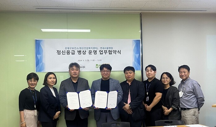 [시민일보 = 이대우 기자] 서울 은평구(구청장 김미경)는 최근 은평구보건소 정신건강복지센터와 지정의료기관 연세서울병원이 정신 응급 공공병상 업무 협약을 체결했다고 밝혔다.
