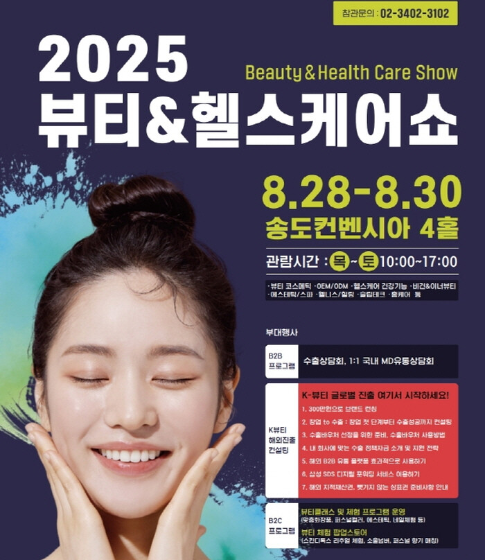올해 전시회는 화장품·코스메틱, 스킨케어·헤어, 헬스케어, 웰니스 서비스 등 다양한 품목의 국내외 120여개사 뷰티, 헬스케어 기업이 참여하며 수출지원존 브랜드 팝업존, 해외 브랜드존, 기관.단체관 등 다양한 특별관도 마련된다.