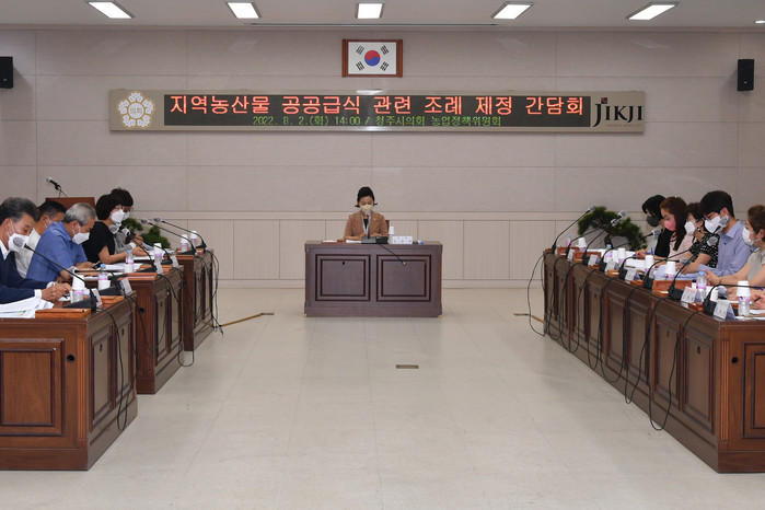 이날 간담회에는 농업정책위원회 의원을 비롯해 청주시 친환경농업인연합회 회장 오현광 등 8개소의 관련 단체가 참석했다. 이들은 당면한 청주시 지역농산물 공공급식 지원에 관한 조례를 제정하기 위해 의견을 모았다. 이외에도 청주시의 푸드플랜 비전 및 추진 계획과 먹거리통합지원센터 설치 및 운영, 푸드플랜 전담팀 신설에 관해 논의했다.