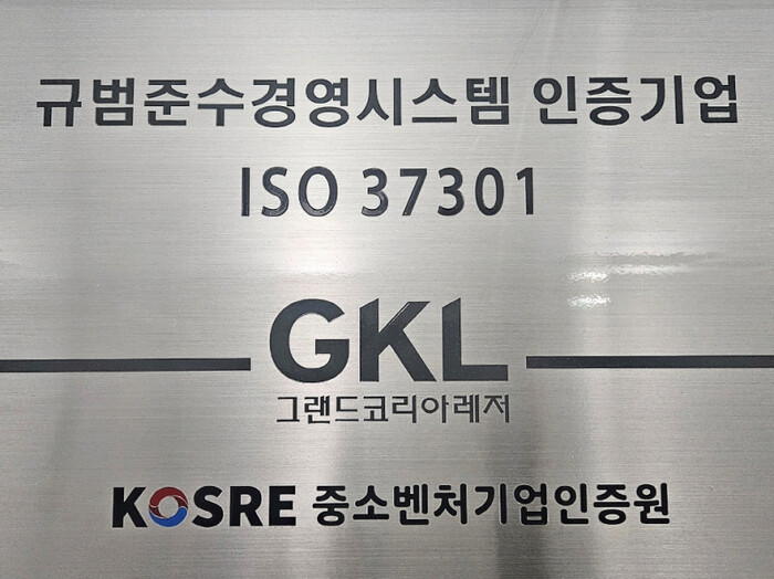 | 그랜드코리아레저 ISO 37301(규범준수경영시스템) 갱신 재인증 현판 (사진=중소벤처기업인증원) |