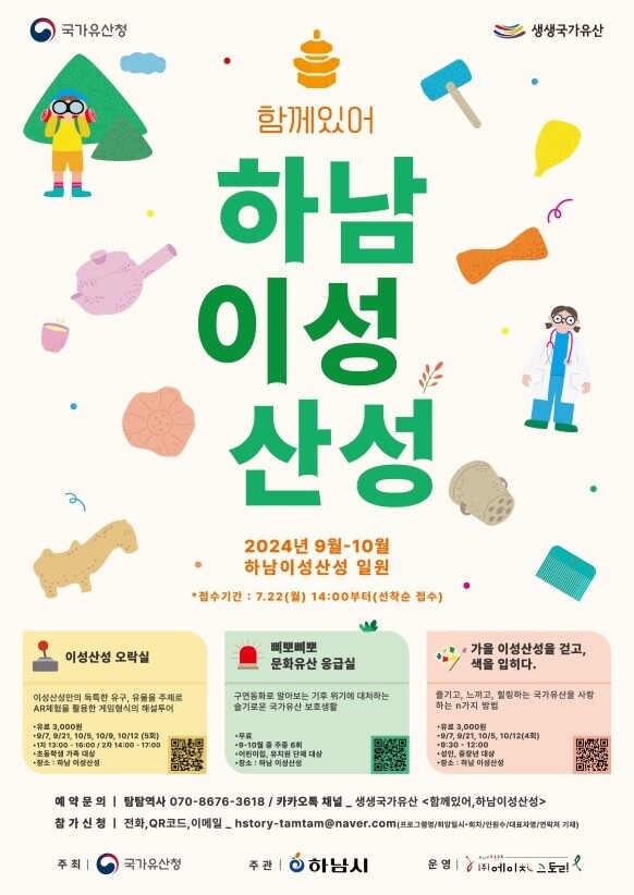 이성산성의 역사적 가치를 체험할 수 있도록 증강현실(AR) 기술을 활용한 게임형식의 해설투어를 진행하는 ‘2024년 생생국가유산 사업-함께 있어, 하남 이성산성’ 주요 프로그램은 ▲이성산성 오락실(5회) ▲삐뽀삐뽀 문화유산 응급실(6회) ▲가을 이성산성을 걷고, 색을 입히다(5회)으로 구성됐다.