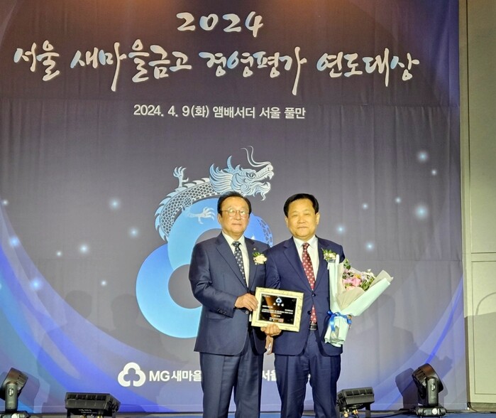 | ▲ 홍은새마을금고 정용래 이사장(오른쪽)이 ‘2024년 새마을금고중앙회 경영평가대상’을 수상하고 있다. (사진=서대문구청 제공) |