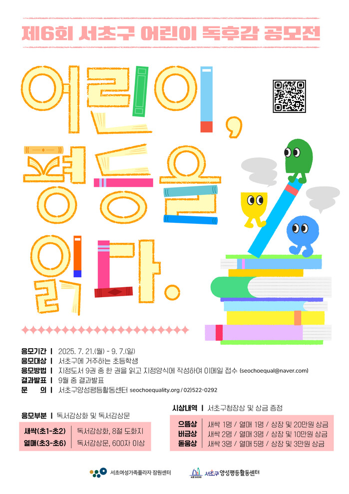 서초구(구청장 전성수)와 서초구양성평등활동센터는 오는 9월7일까지 독후감 공모전 ‘어린이, 평등을 읽다’를 개최한다. 올해 6회째를 맞이한 이번 공모전은 어린이들이 여름방학을 알차게 보내고 ‘평등’에 대한 생각을 키울 수 있도록 마련됐다.