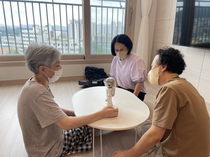 | ▲ 용산구 치매안심전문 자원봉사단이 치매 노인 자택에 방문해 인공지능로봇과 학습을 진행하고 있다. (사진제공=용산구청) |