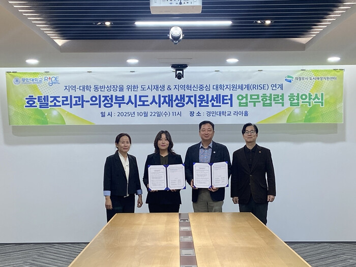 [시민일보 = 민장홍 기자] 경기 의정부시 도시재생지원센터가 22일 경민대학교(RISE사업단ㆍ호텔조리학과)와 ‘의정부동 구도심 상권 재생사업’의 성공적 추진을 위한 업무협약을 체결했다.