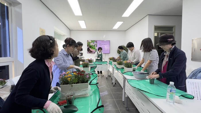| ▲ 가드닝 프로그램에 참여한 주민들이 집안을 화사하게 꾸며줄 국화 화분을 만들고 있다. (사진=마포구청 제공) |