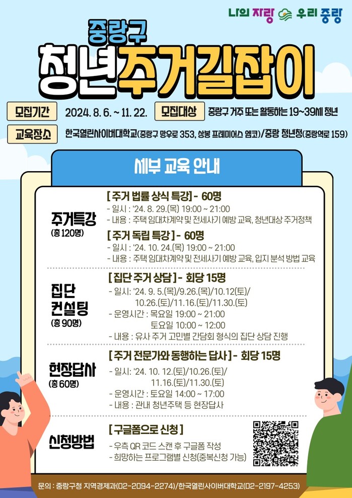 2024 중랑 청년 주거 길잡이는 주거특강 120명(회당 60명), 집단 컨설팅 90명(회당 15명), 현장답사 60명(회당 15명)을 모집하여 최대 300명이 참여할 수 있다. 특히 올해는 교육에 참석한 인원에게 모두 올해 말까지 들을 수 있는 온라인 강의를 무료로 제공한다. 중랑구청 누리집(홈페이지)에 있는 청년 주거 길잡이 사업 포스터 하단의 QR코드를 스캔하고 구글 폼을 작성하여 신청할 수 있다.