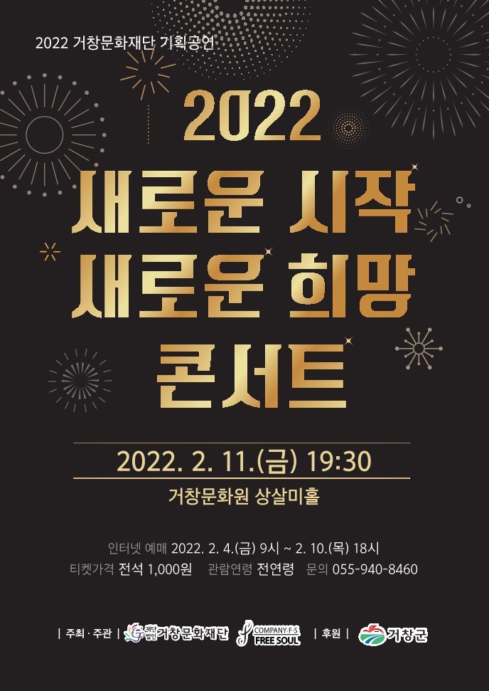 (재)거창문화재단(이사장 구인모 거창군수)은 2월 11일 오후 7시 30분, 거창문화원 상살미홀에서「2022 새로운 시작 새로운 희망 콘서트」를 선보인다고 밝혔다.