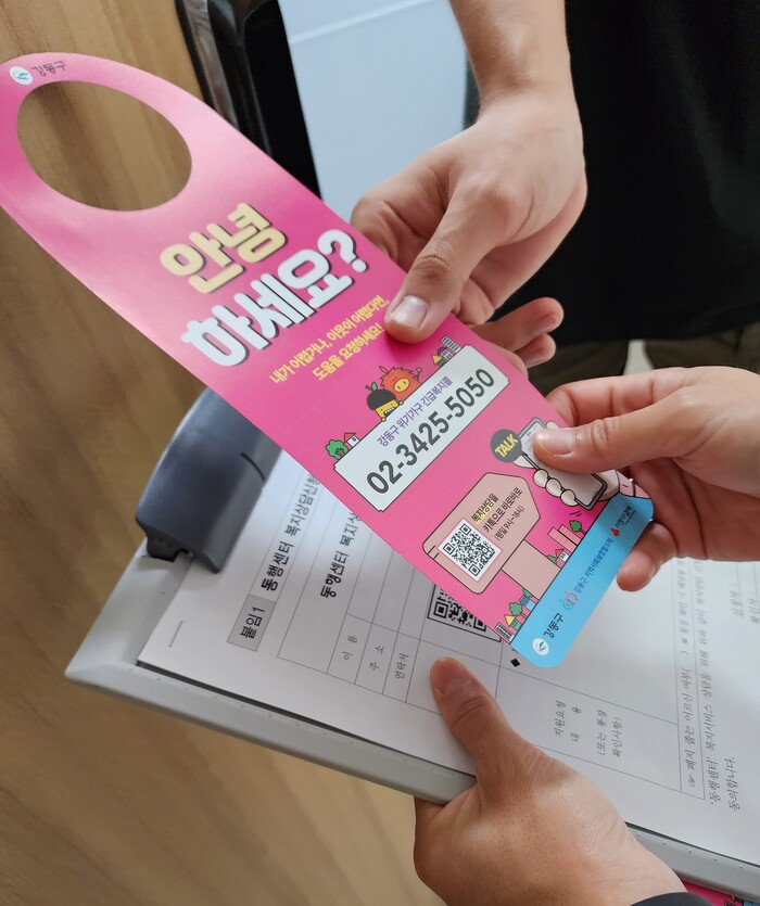 22일 구에 따르면 ‘강동구 방방곳곳 문고리 사업’은 2023 주민등록 사실조사 기간(8월21일~10월10일)에 18개동 복지통장(591명)이 강동구 내 모든 가구를 대상으로 주민등록 불일치 여부를 조사하고 긴급복지콜센터 및 동주민센터와 사회복지시설의 정보가 있는 문고리형 안내문을 전달하는 사업이다.
