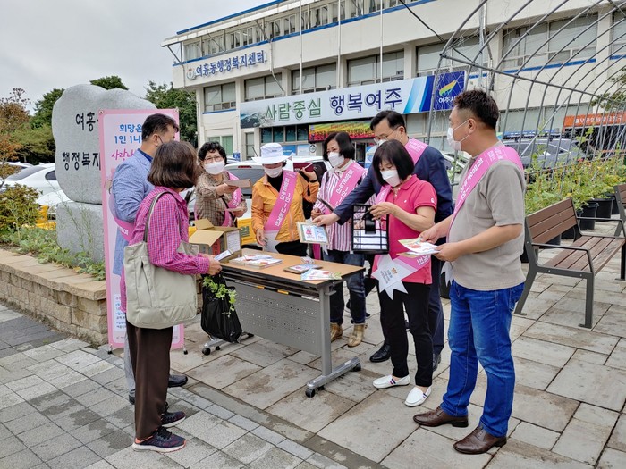 경기 여주시 여흥동 지역사회보장협의체가 15일 제4차 정기회의 이후 여흥동행정복지센터 입구를 중심으로 지역내 지역주민에게 희망온누리 1인 1나눔 계좌갖기 가두 캠페인을 전개했다. 사진은 캠페인에서 협의체 위원들이 주민들에게 희망온누리 1인 1나눔 계좌갖기 사업에 대한 홍보 및 안내를 하고 있는 모습. (사진제공=여주시청)