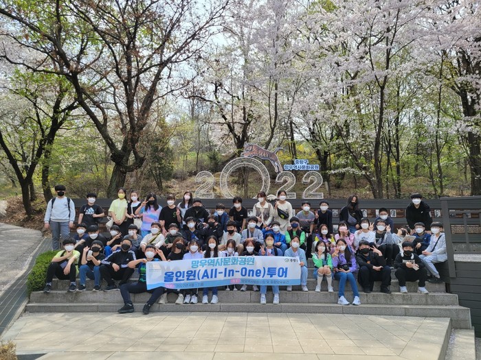 서울 중랑구는 최근 신묵초등학교 6학년 학생들과 망우역사문화공원에 이달 문을 연 중랑망우공간 개관 투어를 진행했다. 투어는 중랑망우공간의 망우 미디어홀, 망우 카페, 교육 전시실 관람 후 망우역사문화공원에 영면한 유관순 열사 묘역을 탐방하는 순서로 진행했다. 사진은 이날 학생들이 망우역사문화공원 인물가벽 앞에서 기념촬영을 하고 있는 모습. (사진제공=중랑구청)