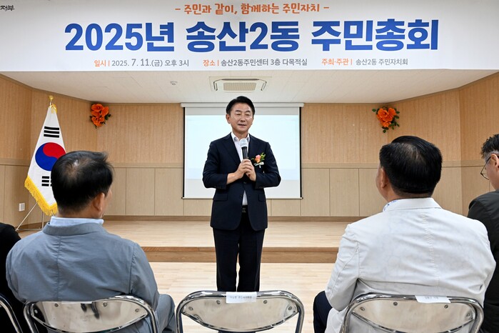 경기 의정부시 송산2동 주민자치회가 최근 ‘2025년 송산2동 주민총회’를 성황리에 개최했다. 이날 총회에는 지역 주민을 비롯해 김동근 시장, 국회의원, 도의원, 시의원과 동두천시 생연1동 주민자치회 위원 등 100여명이 참석했다. 사진은 김동근 시장이 인사말을 하는 모습. (사진=의정부시청 제공)