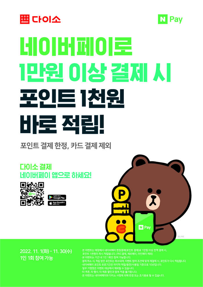 아성다이소에 따르면 이번 이벤트는 이달 한 달 간 진행되며, 다이소 매장에서 ‘네이버페이 포인트’로 1만원 이상 결제 시, ‘네이버페이 포인트’ 1000원을 즉시 적립해준다.
