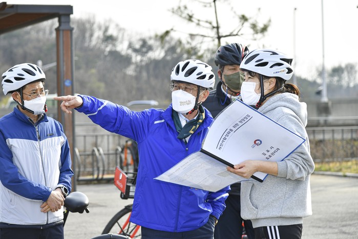 정하영 경기 김포시장이 5일 서울연결 한강변 자전거도로 재정비 공사 구간 특별 현장점검을 했다. 이날 정 시장은 자전거를 타고 향산배수펌프장~평화누리길~판개목쉼터 7.5km 구간을 주행하며 불편사항과 문제점을 로드체킹했다. 사진은 정 시장(가운데)이 관계자들과 대화를 나누고 있는 모습. (사진제공=김포시청)