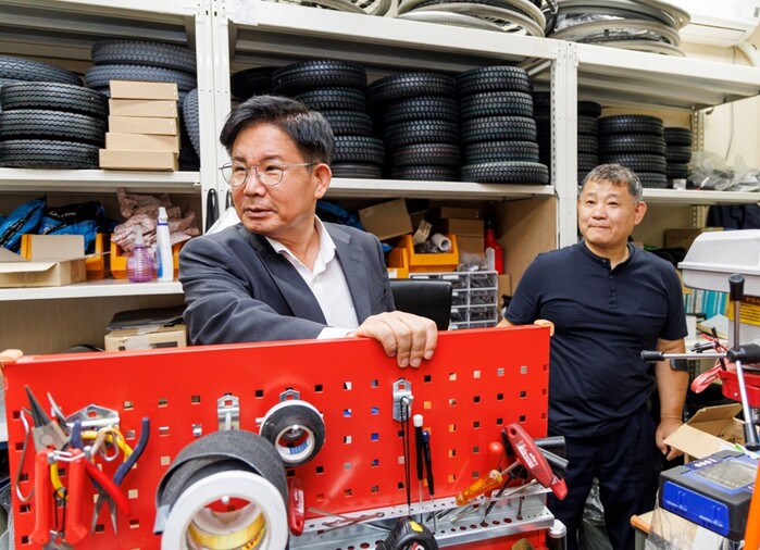 | ▲ 마포장애인종합복지관 내 마포보장구수리센터에 방문한 박강수 구청장(왼쪽). (사진=마포구청 제공) |