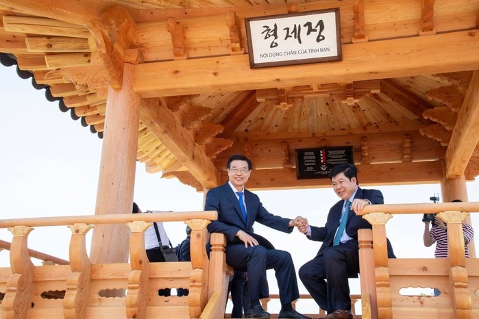 용산구가 최근 베트남 퀴논(Quy Nhon)시에서 교류 26주년 기념식과 건립한 한옥정자 ‘형제정’ 준공식을 개최했다. 한옥정자는 안푸팅 신도시내 200㎡ 규모로 조성됐으며, 퀴논시가 건립부지·기반공사 자재를 제공했다. 사진은 성장현 구청장(왼쪽)과 퀴논시장이 형제정에 앉아 기념사진을 찍는 모습. (사진제공=용산구청)