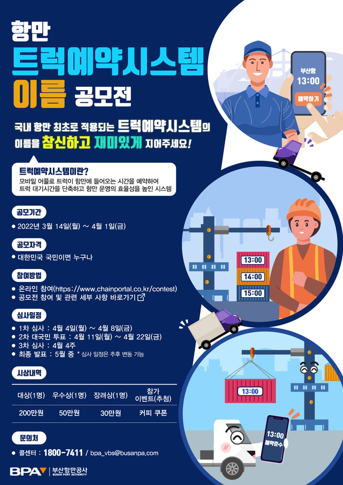부산항만공사(이하 ‘BPA’, 사장 강준석)는 컨테이너를 운송하는 트럭의 대기시간을 줄이기 위해 부산항에 적용 중인 차량반출입예약시스템(Vehicle Booking System)의 이름을 공모한다.