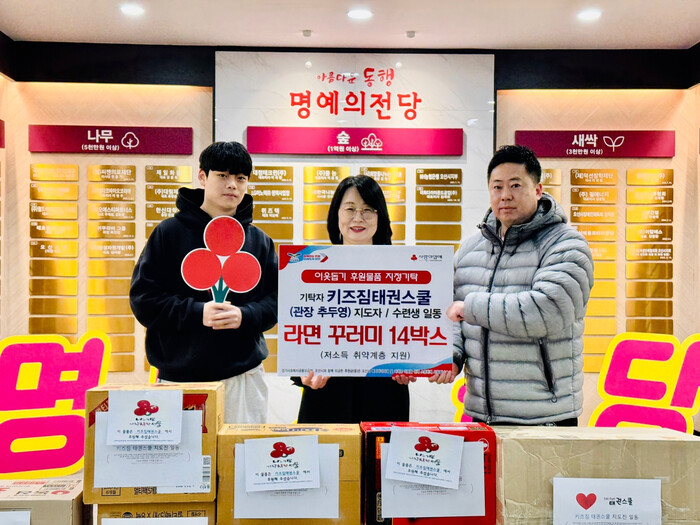 이번 기탁은 키즈짐태권스쿨 지도자와 수련생들이 연말연시를 맞아 십시일반 마음을 모아 마련한 것으로, 지역사회 이웃들에게 따뜻한 온정을 전하고자 추진됐다. 이날 기탁식에는 추두영 관장과 이동준 사부 등이 참석해 나눔의 의미를 함께 나눴다.