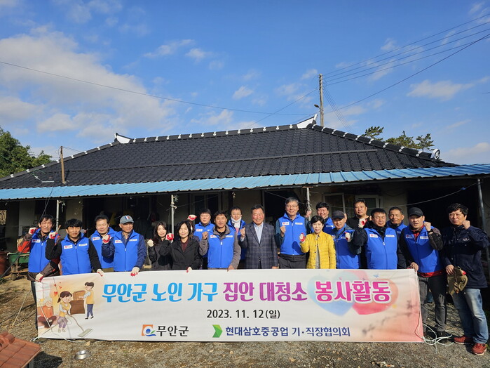 이날 봉사활동은 무안읍, 무안군사회복지협의회, 현대삼호중공업기직장협의회가 합동 참여했고, 현대삼호중공업 김환규 전무이사 등 직장협의회 회원 20여 명이 휴일을 반납하고 달려와 구슬땀을 흘리며 어르신들의 깨끗하고 쾌적한 보금자리를 만드는 데 힘을 보탰다.