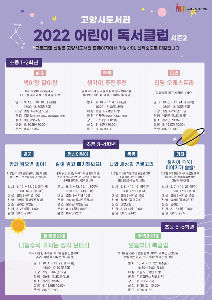 초등학교 5~6학년 대상 독서클럽은 ▲나눌수록 커지는 생각 보따리(화정어린이도서관) ▲오늘부터 북클럽(주엽어린이도서관) 등 2개가 운영된다.
