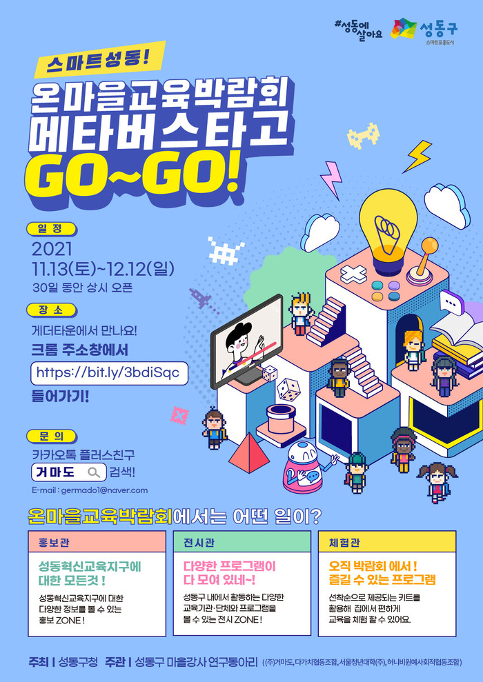 오는 13일부터 12월12일까지 진행하는 구청이 주최하고 마을강사 연구동아리가 주관하는 온마을 교육박람회는 주 수혜자인 청소년의 참여도를 높이기 위하여 최근 주목받고 있는 메타버스 기술을 활용한 비대면 박람회로 개최된다. 참여자는 아바타를 이용하여 가상현실로 구현된 박람회 행사장을 체험할 수 있다.
