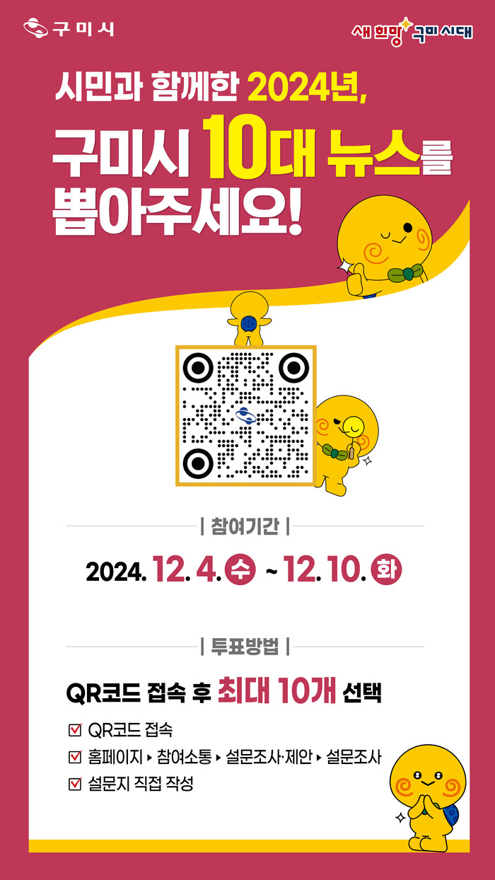 설문은 4일부터 오는 10일까지 7일간 홈페이지에서 진행되며, 구미시정에 관심 있는 누구나 참여할 수 있다. 참여는 시 홈페이지의 ‘설문조사’ 메뉴에서 가능하며, QR코드를 통해서도 손쉽게 응답할 수 있다.