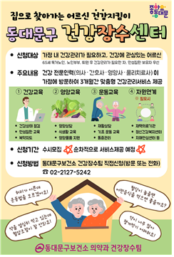 [시민일보 = 이대우 기자] 서울 동대문구(구청장 이필형)가 지역내 노인들의 건강한 노후 지원을 위해 ‘건강장수센터 방문건강관리서비스’를 본격 추진한다.