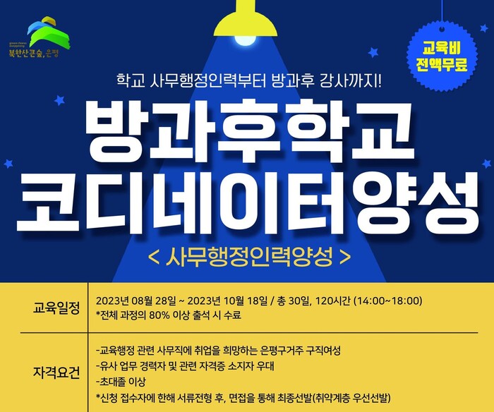 [시민일보 = 이대우 기자] 서울 은평구(구청장 김미경)가 경력단절여성의 취업을 돕는 ‘방과후학교 코디네이터 양성과정’에 참여할 교육생을 오는 8월23일까지 모집한다고 밝혔다.