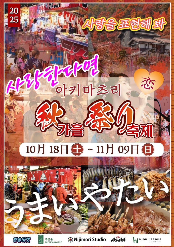 일본 전통 문화 테마파크 니지모리스튜디오(경기도 동두천시)는 오는 10월 18일(토)부터 11월 9일(일)까지 23일간, 가을의 정취와 낭만을 가득 담은 ‘2025 아키마츠리 가을축제’를 개최한다.