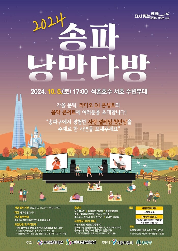 [시민일보 = 이대우 기자] 송파구(구청장 서강석)는 오는 5일 17시부터 석촌호수 서호 수변무대에서 가족 페스티벌 ‘2024 송파낭만다방’을 개최한다고 밝혔다.