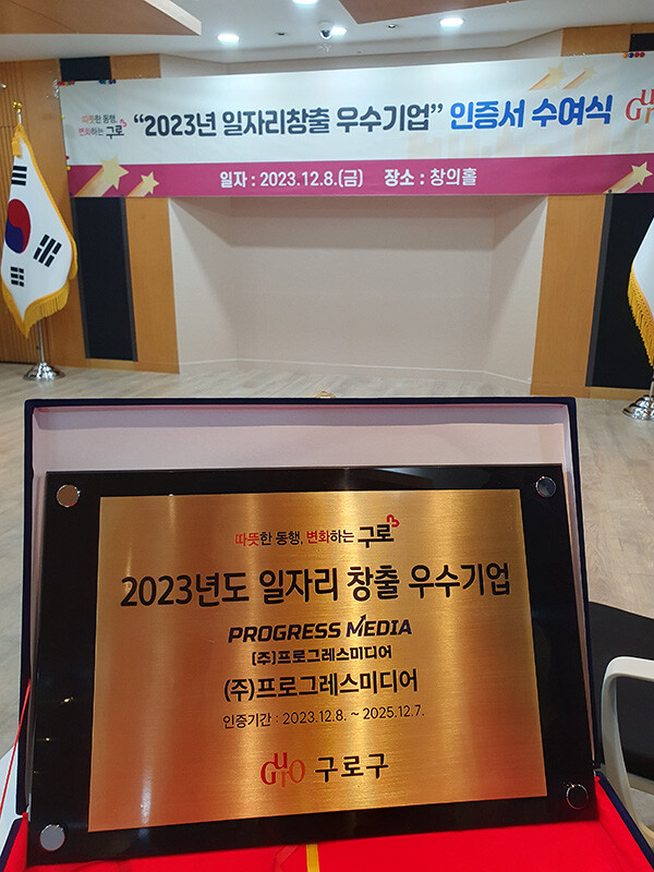 일자리 창출 우수기업 선정은 구로구에서 고용증가율이 높고, 복리후생 등 근로조건이 우수한 관내 중소기업들 중에 선정되며, ㈜프로그레스미디어는 일자리창출 우수기업 평가에서 배점이 가장 높은 최근 2년간 근로자수 증가율(133%) 및 청년채용 비율(69%)에서 높이 평가되어 2번째로 선정되었다.