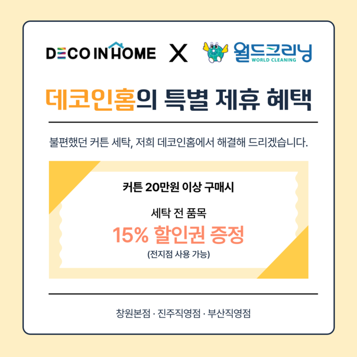 이번 제휴를 통해 데코인홈은 20만원 이상의 커튼 구매 고객을 대상으로 월드크리닝에서 커튼 블라인드 세탁 서비스를 이용할 수 있는 할인권을 증정할 방침이다. 해당 할인권은 진주, 진해, 사천 등 전국의 모든 지점에서 발행하며 커튼뿐만 아니라 전 품목에 적용이 가능하다.