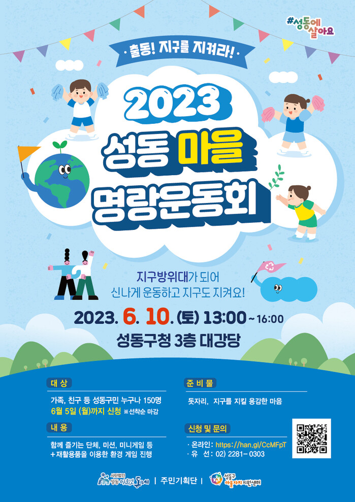 [시민일보 = 홍덕표 기자] 성동구(구청장 정원오)가 오는 10일 오후 1시부터 구청 3층 대강당에서 주민들의 공동체 활동을 응원하고 격려하며 화합과 소통의 장을 만드는 '2023 성동마을 명랑운동회'를 개최한다.