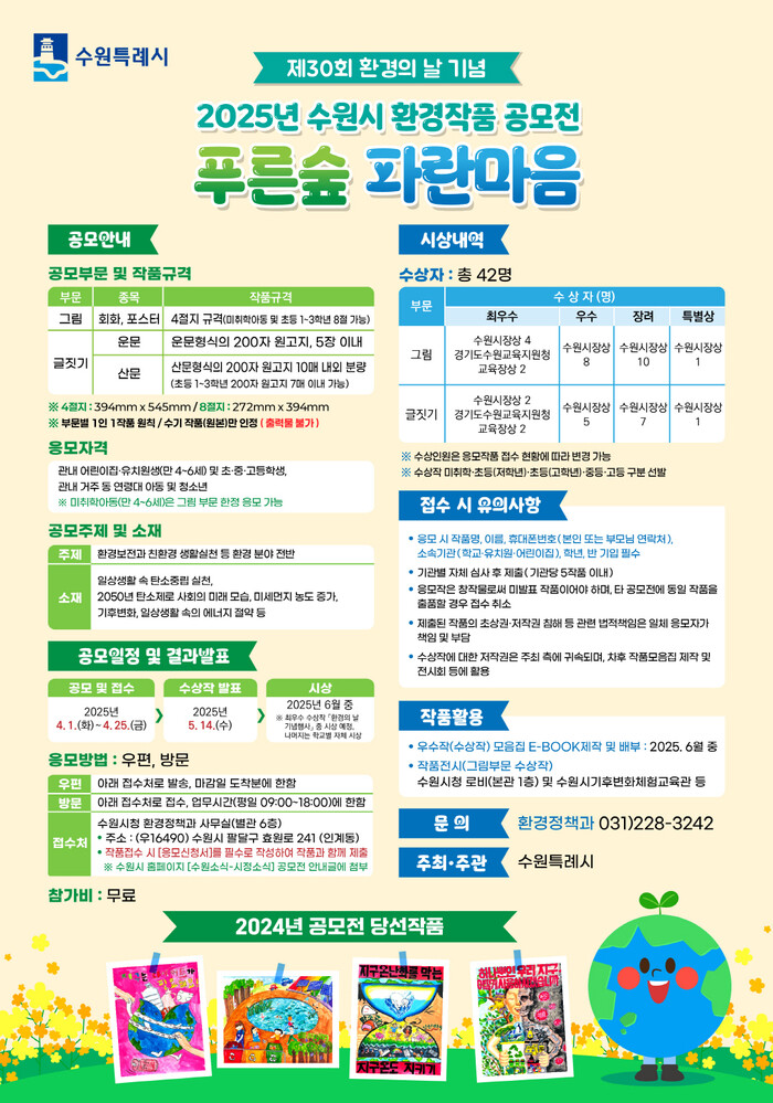 2개 부문에서 수상자 42명(그림 25명ㆍ글짓기 17명)을 선정해 수원시장, 경기도수원교육지원청 교육장 명의 상장을 수여한다.