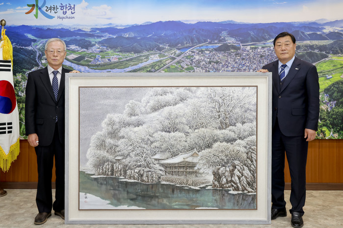 이번 작품기증은 고향에서 작가의 고희연을 기념하여 작품전시회를 할 수 있게 된데 대한 고마움의 표시로 합천을 대표하는 절경과 문화재자료인 함벽루를 배경으로 한‘눈꽃속의 함벽루’란 작품을 기증하게 됐다.