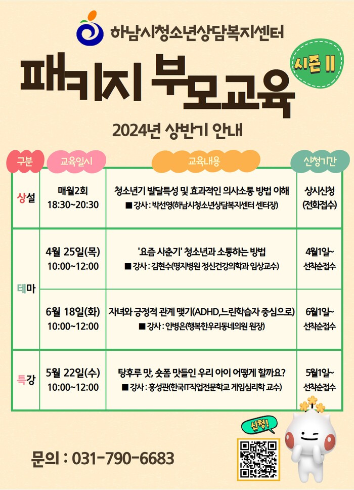 각 교육은 청소년상담복지센터 내에서 진행되며, 참여를 희망하는 시민은 신청기간 내 QR코드로 간편하게 신청할 수 있으며 신청은 선착순으로 마감된다.