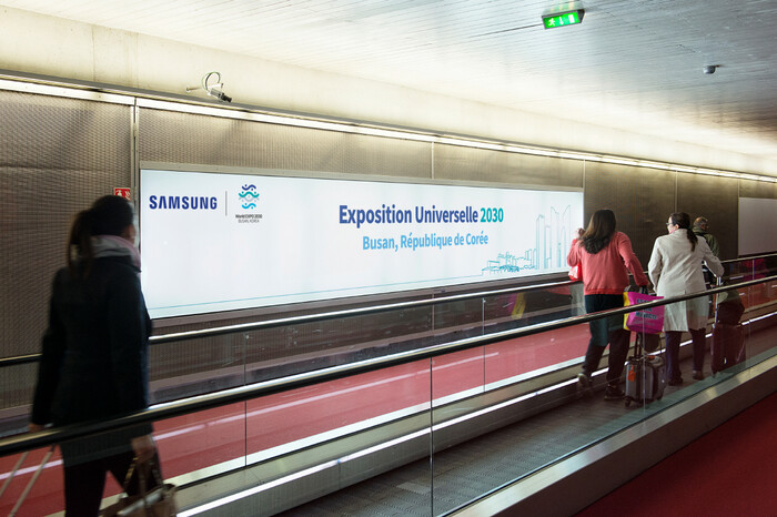 샤를드골 공항 이용객들은 100미터 이상의 이동동선에 연달아 자리잡은 광고판에서 다양한 갤럭시 광고와 더불어 부산의 인상적인 모습을 일러스트로 표현한 부산엑스포 홍보 이미지를 접할 수 있다.