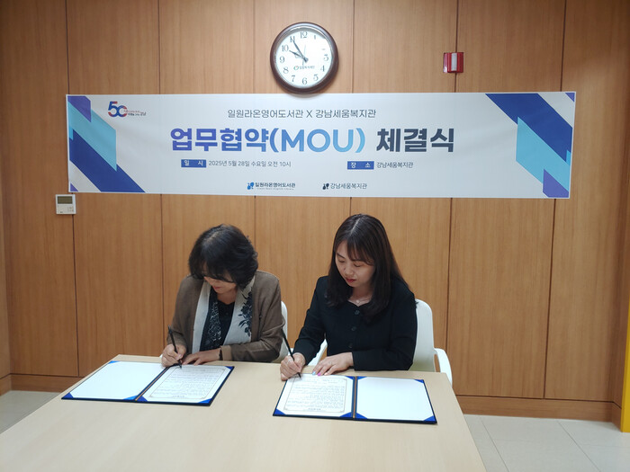 [시민일보 = 이대우 기자] (재)강남문화재단 일원라온영어도서관(이사장 김종섭)이 최근 밀알복지재단에서 위탁 운영하는 강남세움복지관과 지역사회 발전을 위한 업무협약(MOU)를 체결했다.
