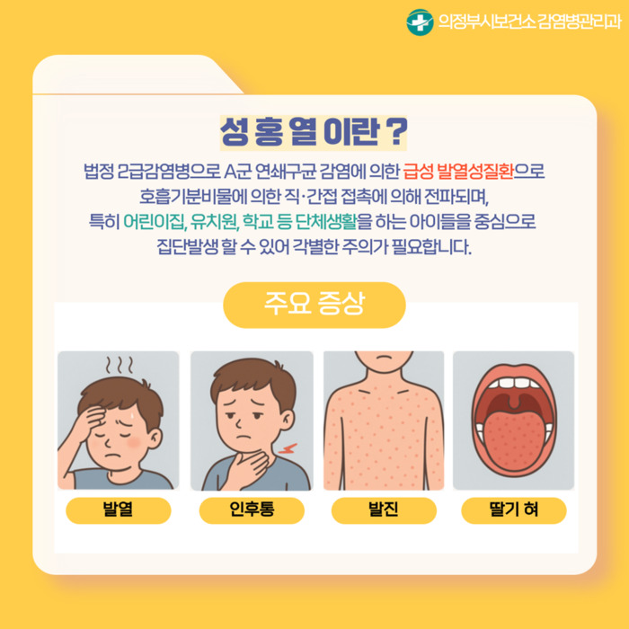 [시민일보 = 민장홍 기자] 경기 의정부시 보건소는 소아, 청소년을 중심으로 성홍열 발생이 증가함에 따라 시민 건강 보호를 위해 감염병 예방 수칙 준수를 안내하고 적극적인 실천을 당부했다.