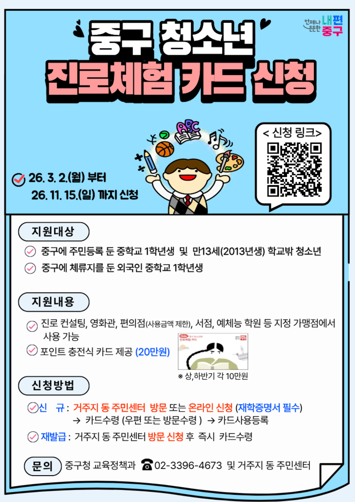 [시민일보 = 여영준 기자] 서울 중구는 지역 청소년들의 다양한 진로 탐색과 문화·예술 체험 기회를 확대하기 위해 ‘청소년 진로체험카드’를 지급한다고 5일 밝혔다.