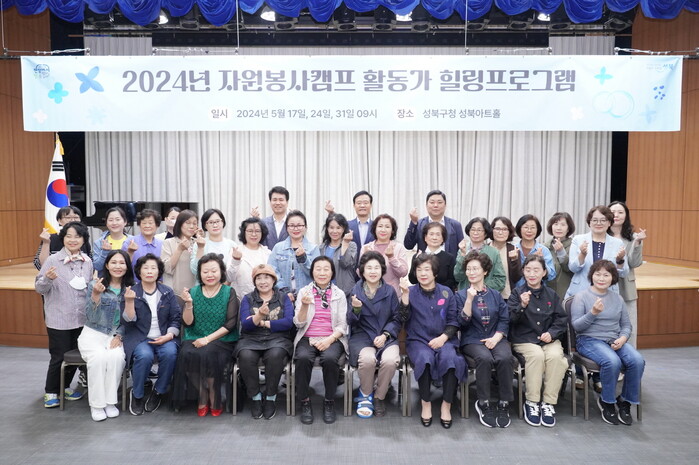 [시민일보 = 변은선 기자] 서울 성북구(구청장 이승로)가 최근 5회에 걸쳐 구청 아트홀과 성북구 자원봉사센터에서 20개동 자원봉사캠프 활동가 등을 대상으로 '2024년 자원봉사캠프 활동가 힐링프로그램'을 진행했다.