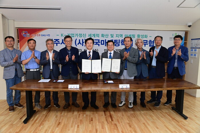 협약식에는 조규일 진주시장과 박철 한국마케팅학회 회장, 김기찬 가톨릭대학교 교수, 정대율 경상국립대학교 교수 등 10여 명이 함께했다.
