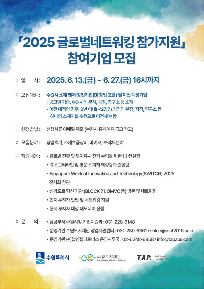 [수원=임종인 기자] 경기 수원시가 ‘2025 글로벌네트워킹 프로그램’에 참여할 지역내 스타트업 7개사를 모집한다.