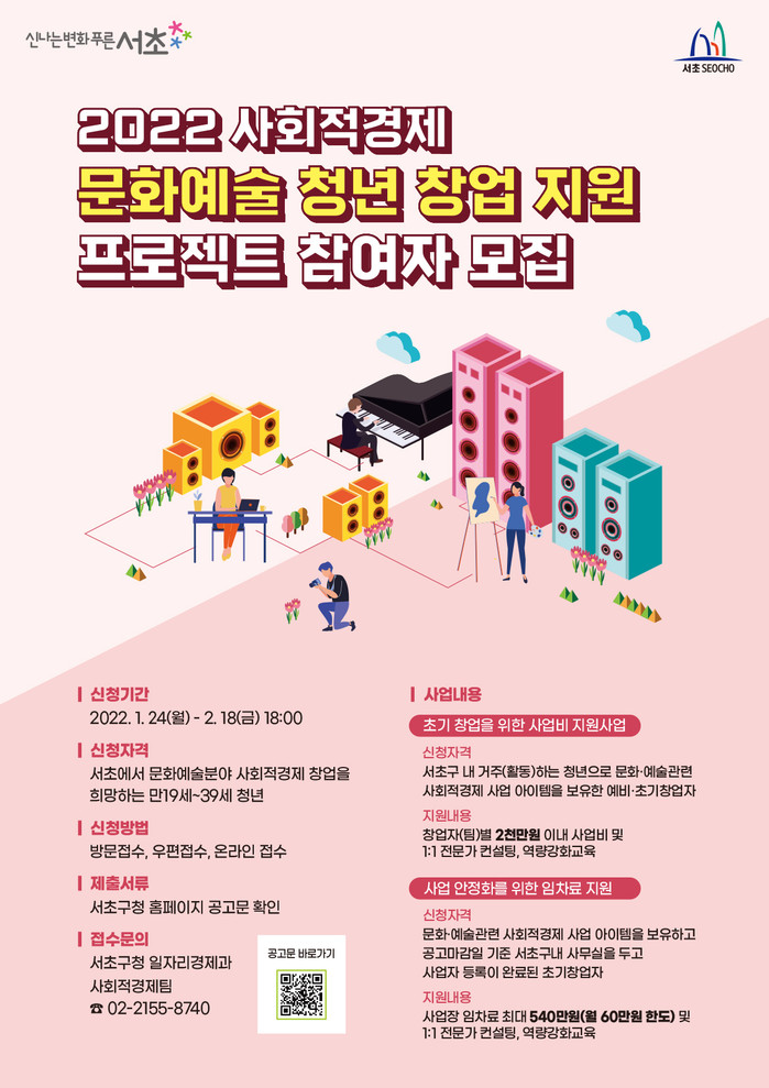 [시민일보 = 이대우 기자] 서초구가 오는 18일까지 ‘사회적 경제 문화예술 청년 창업지원 프로젝트’의 참여팀을 모집한다.