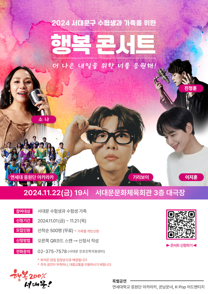 [시민일보 = 이대우 기자] 서울 서대문구(구청장 이성헌)가 오는 22일 오후 7시~8시40분 서대문문화체육회관 대극장에서 ‘2024 서대문 수험생 행복콘서트’를 개최한다.